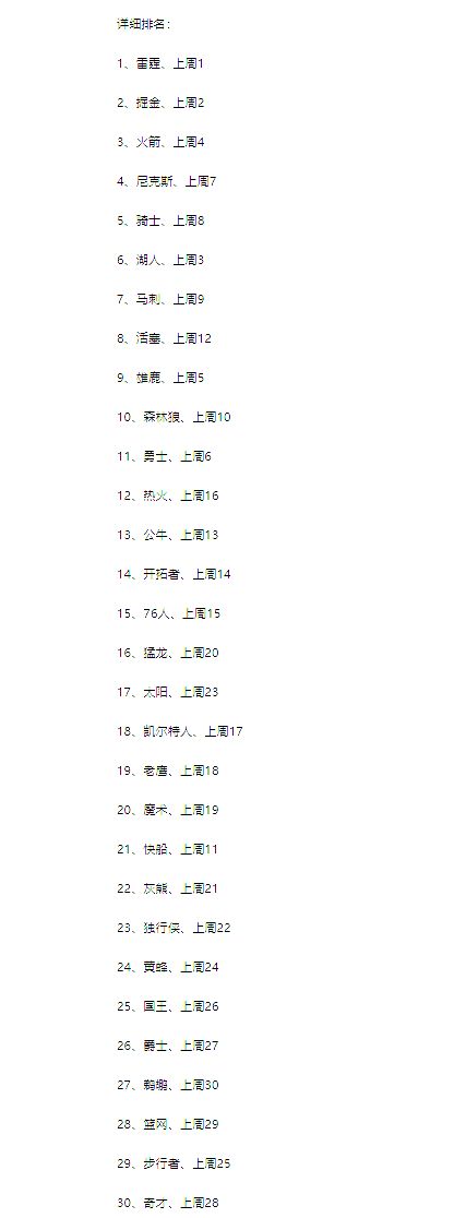 附30支球队的全部排名: